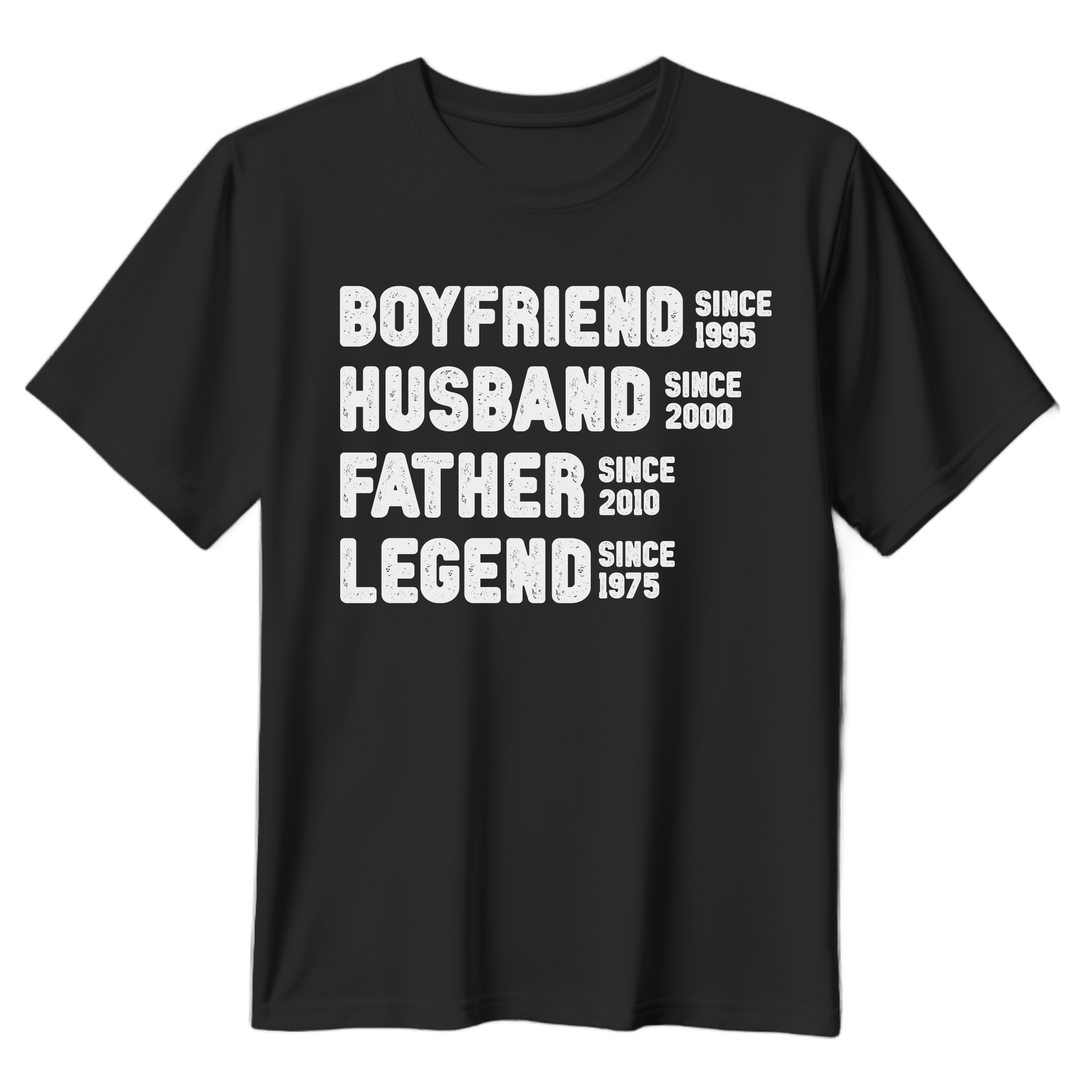 Customize this epic tee with the years he unlocked each level of greatness — Boyfriend (when he still had abs), Husband (when he gave up the remote), and Father (when sleep became a memory).