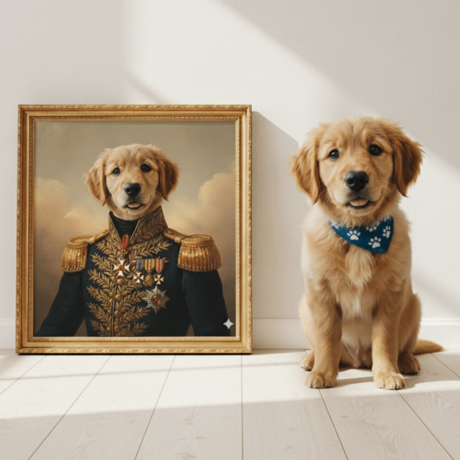 Simply upload a clear photo of your pet, choose a Renaissance outfit style, and place your order. Our artists will create a stunning digital portrait of your pet as a noble general, admiral, or queen — just like from the 1800s!